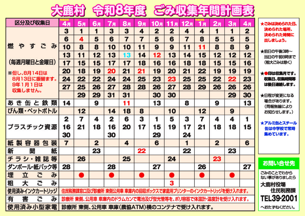 - 埋立ごみの収集日は同報無線でお知らせします。