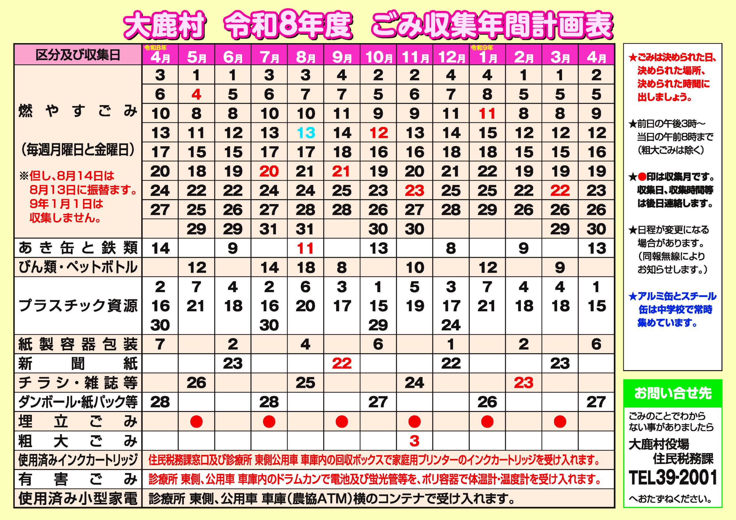 令和8年度の年度のごみ収集計画(令和9年4月まで)の月別カレンダー