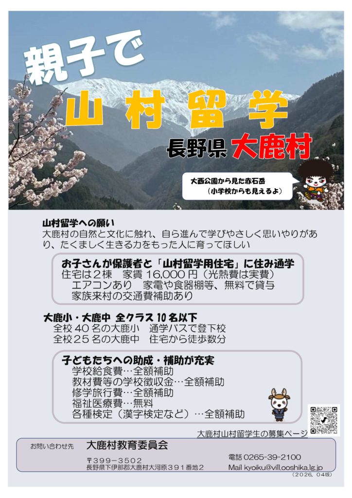 なお、学齢児童生徒と共に一家で大鹿村に引っ越し(移住)したいと考えている方も相談に乗りますので、大鹿村教育委員会へお問い合わせください。